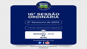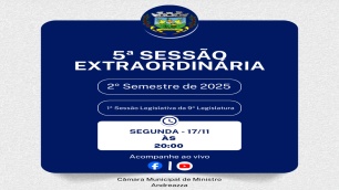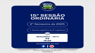 4ª Sessão Extraordinária do 2º Semestre de 2025. Câmara Municipal de Ministro Andreazza convida a todos para participar da 4ª Sessão Extraordinária que será realizada segunda-feira 10.11.2025 as 20:00 horas. Participe das sessões do município e faça parte das decisões que impactam diretamente sua comunidade.A Câmara Municipal de Ministro Andreazza conta com sua presença e participação! junte-se a nós na construção de um legislativo atuante e comprometido com o bem estar da nossa comunidade. 4ª Sessão Extraordinária do 2º Semestre de 2025 da 1ª Sessão Legislativa da 9ª Legislatura.Câmara Municipal de Ministro AndreazzaPalácio Nova Brasília Acesse os projetos completos pelo sistema de apoio ao processo legislativo (SAPL):https://sapl.ministroandreazza.ro.leg.br/ Acompanhe a transmissão ao vivo através do nosso site oficial:https://www.facebook.com/camara.m.andreazza?mibextid=ZbWKwLhttps://www.youtube.com/@CamaraMAndreazza